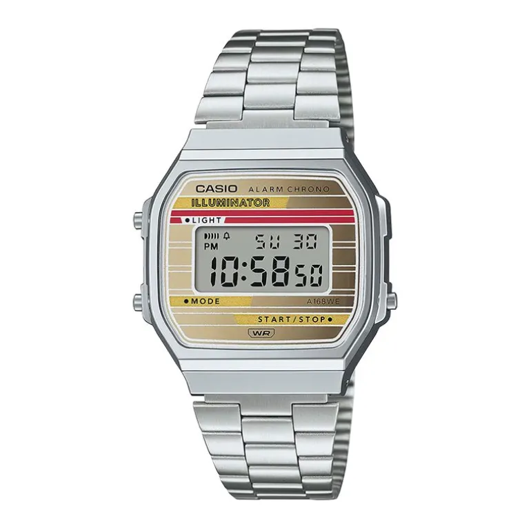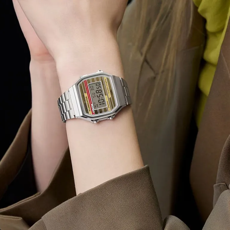 Elle est dotée d’un boîtier rectangle de 38.6 × 36.3 × 9.6 mm en résine couleur argent, et le cadran or contraste élégamment sous un verre en résine. L’affichage numérique offre une lisibilité claire et nette, soutenu par un mouvement quartz fiable.