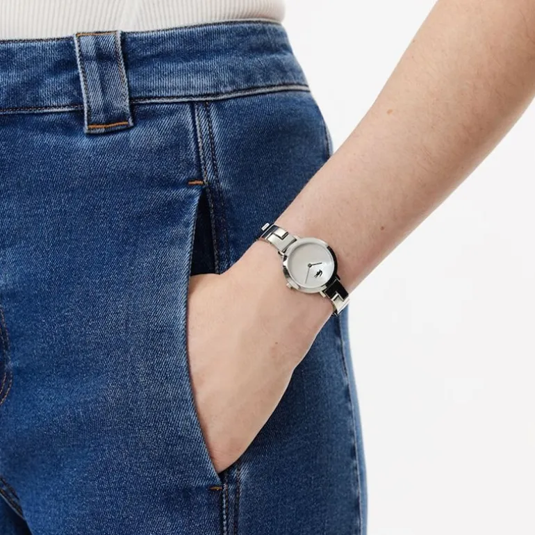 Elle possède un boîtier rond de 28 mm fabriqué en acier inoxydable couleur argent, avec un cadran blanc nacré qui ajoute une touche de raffinement et reflète délicatement la lumière.