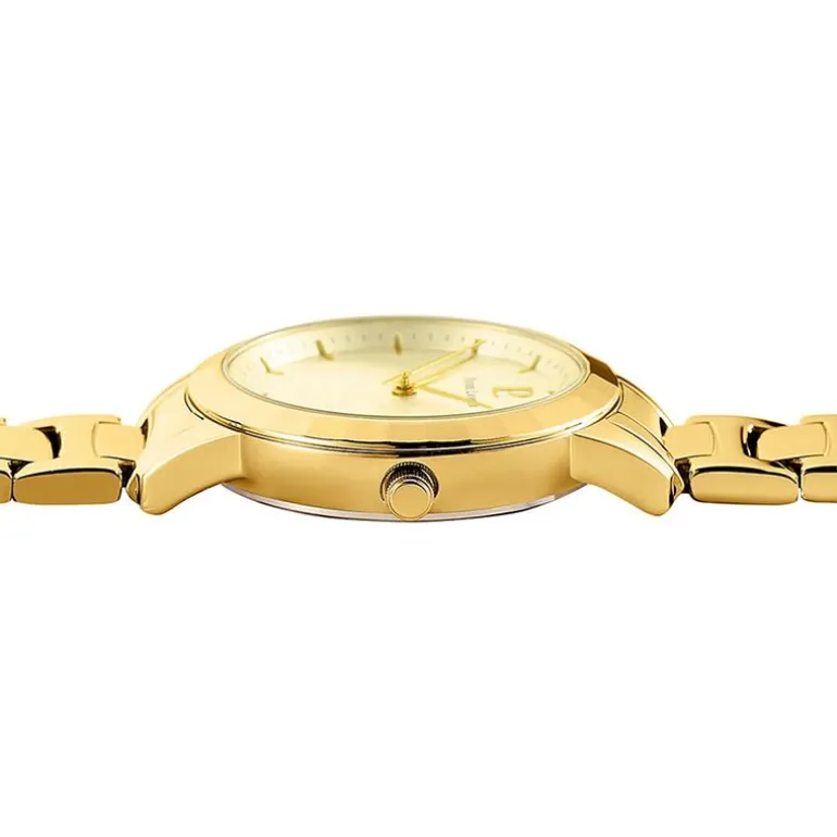 Le boîtier rond de 32 mm, réalisé en acier inoxydable couleur or, encadre un cadran or éclatant, protégé par un verre minéral robuste. L’affichage analogique, animé par un mouvement quartz fiable, offre une lisibilité parfaite et une tenue de l’heure précise.